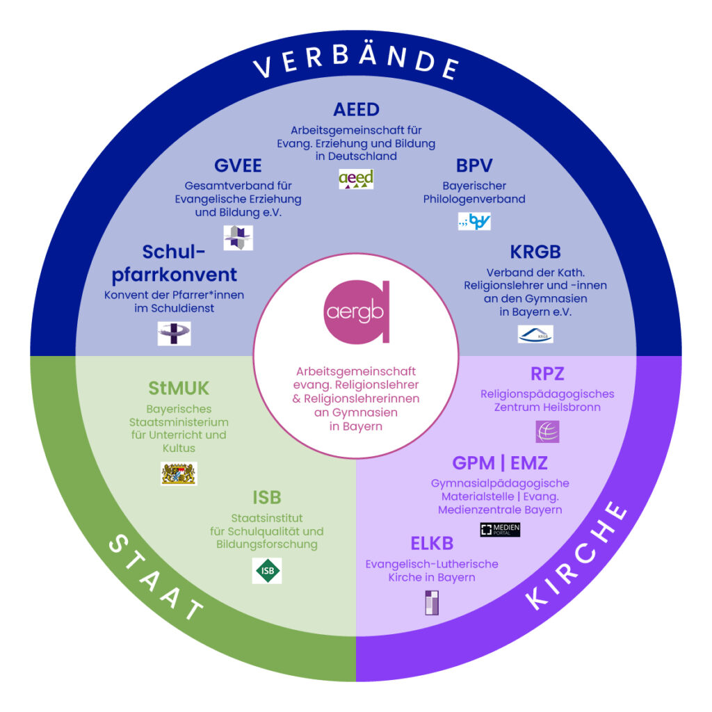 Das Staatsinstitut für Schulqualität und Bildungsforschung (ISB) entwickelt im Auftrag des Kultusministeriums u. a. die Lehrpläne aller Schularten, arbeitet an der Erstellung zentraler Prüfungsaufgaben (wie dem Abitur) und wirkt bei der Fortbildung der Lehrkräfte mit. Im jährlich erscheinenden Kontaktbrief werden den Fachschaften zu Beginn eines Schuljahres fachspezifische und fachungebundene Hinweise und Informationen übermittelt. Auf der Homepage des ISB finden sich auch wichtige Grundsatzinformationen zum RU, z. B. das KMS zu Grundlagen des Religionsunterrichts und der religiösen Erziehung (vom 17.08.2023) sowie die Einheitlichen Prüfungsanforderungen in der Abiturprüfung (EPA) für das Fach Evangelische Religionslehre. Die AERGB steht in Austausch mit der Fachreferentin für Evangelische Religionslehre im ISB.